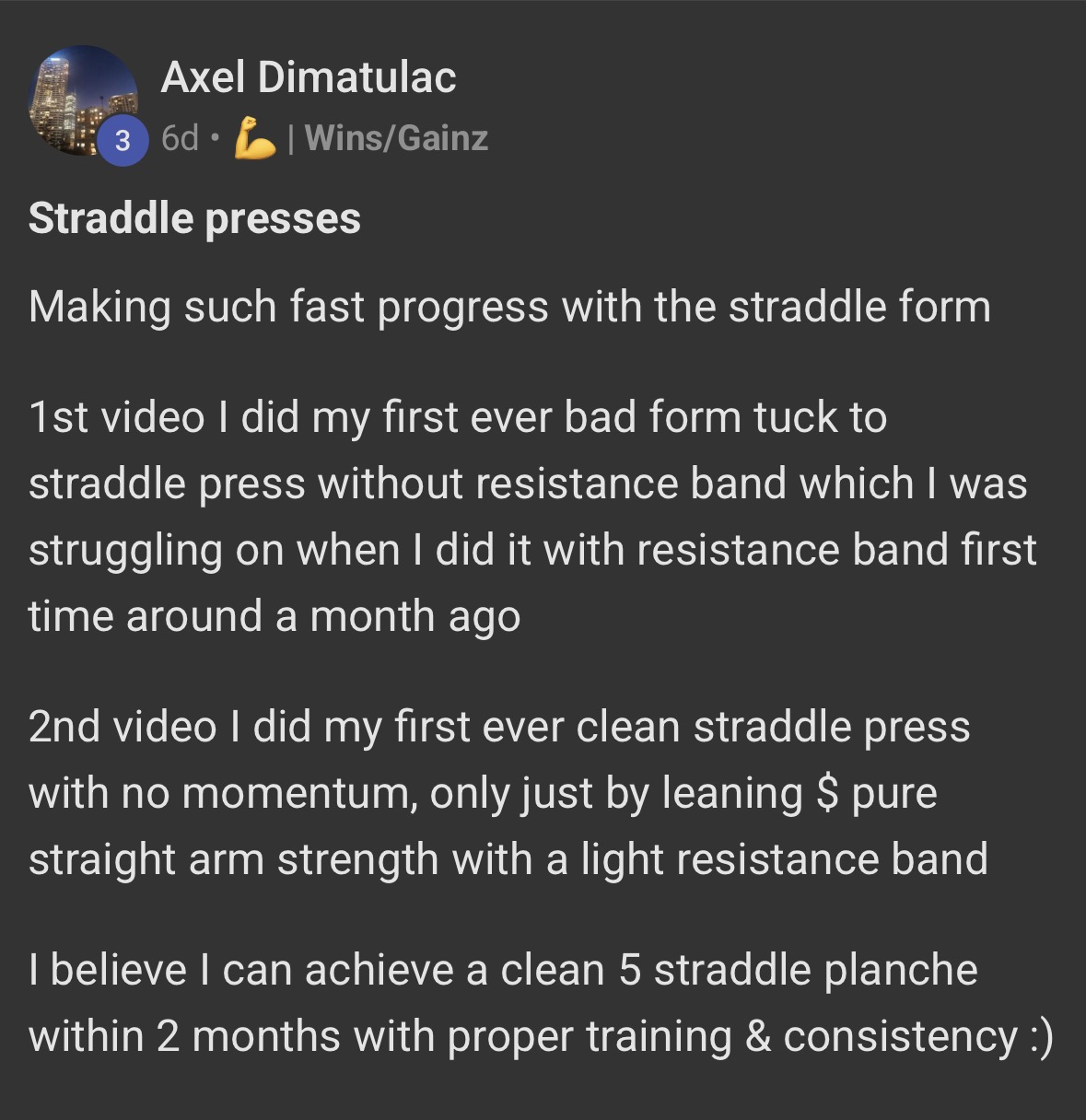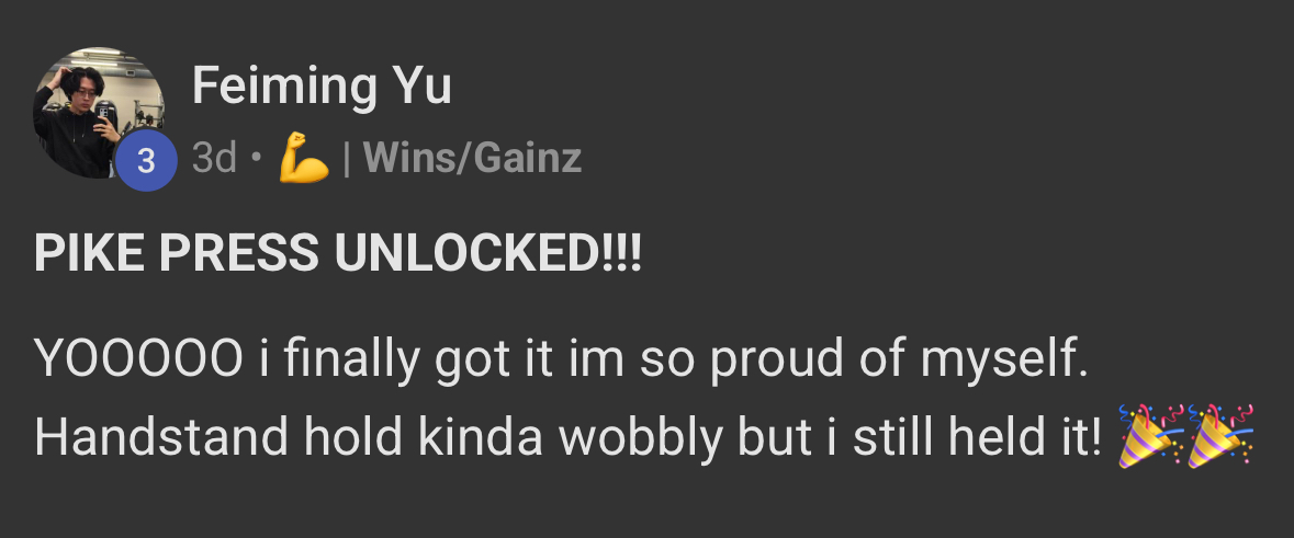 Morfy was stuck learning the one arm handstand, from barely getting his supporting arm off the floor to properly getting his hand off the floor and getting consistent 5 second holds within 2 months.